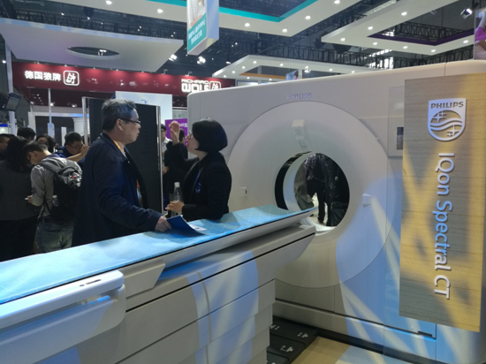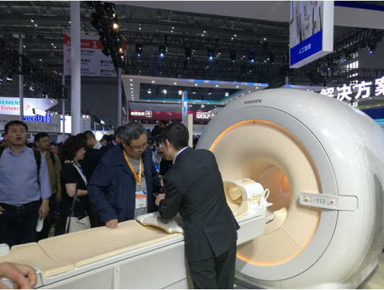 廠商工作人員向參觀者介紹PHILIPS核磁產品