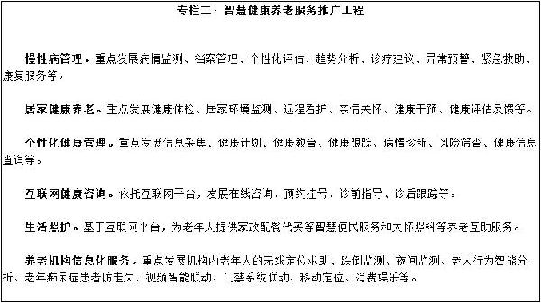培育智慧健康養老服務新業態。推動企業和健康養老機構充分運用智慧健康養老產品,創新發展慢性病管理、居家健康養老、個性化健康管理、互聯網健康咨詢、生活照護、養老機構信息化服務等健康養老服務模式。